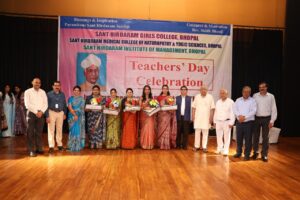 The program, which began with the lighting of the ceremonial lamp, saw Dr. Dalima Parwani, Principal of Sant Hirdaram Girls’ College, stressing that a teacher not only imparts knowledge but also instills values and culture. She further explained that it is the duty of a teacher to inspire students to ask the right questions and guide them toward honesty, tolerance, and continuous self-development.