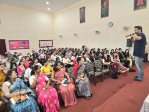 On the second day of the induction program, Chartered Accountant and Financial Trainer Nikhil Nainani was the keynote speaker for the first session. In his lecture on the topic “Reskill, Upskill, Multiskill – Your Strategy for Industry Success”, he addressed students about the evolving needs of the industry in today’s competitive era. He emphasized that continuous learning and being multi-skilled is the key to success.