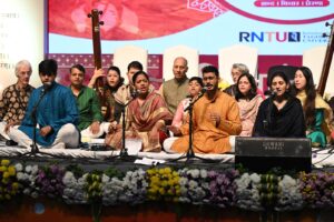 The second day commenced with Manglacharan performed by artists from the Dhrupad Sansthan, presenting ragas Bhopali, Kalind, Yaman, and Kedar, filling the auditorium with melody and grandeur. This was followed by a session on literature, art, and human consciousness in the age of AI. Nandkishore Acharya and Santosh Chaube engaged in a deep discussion on linguistic and cultural crises, the impact of generative AI, and the safeguarding of human consciousness.