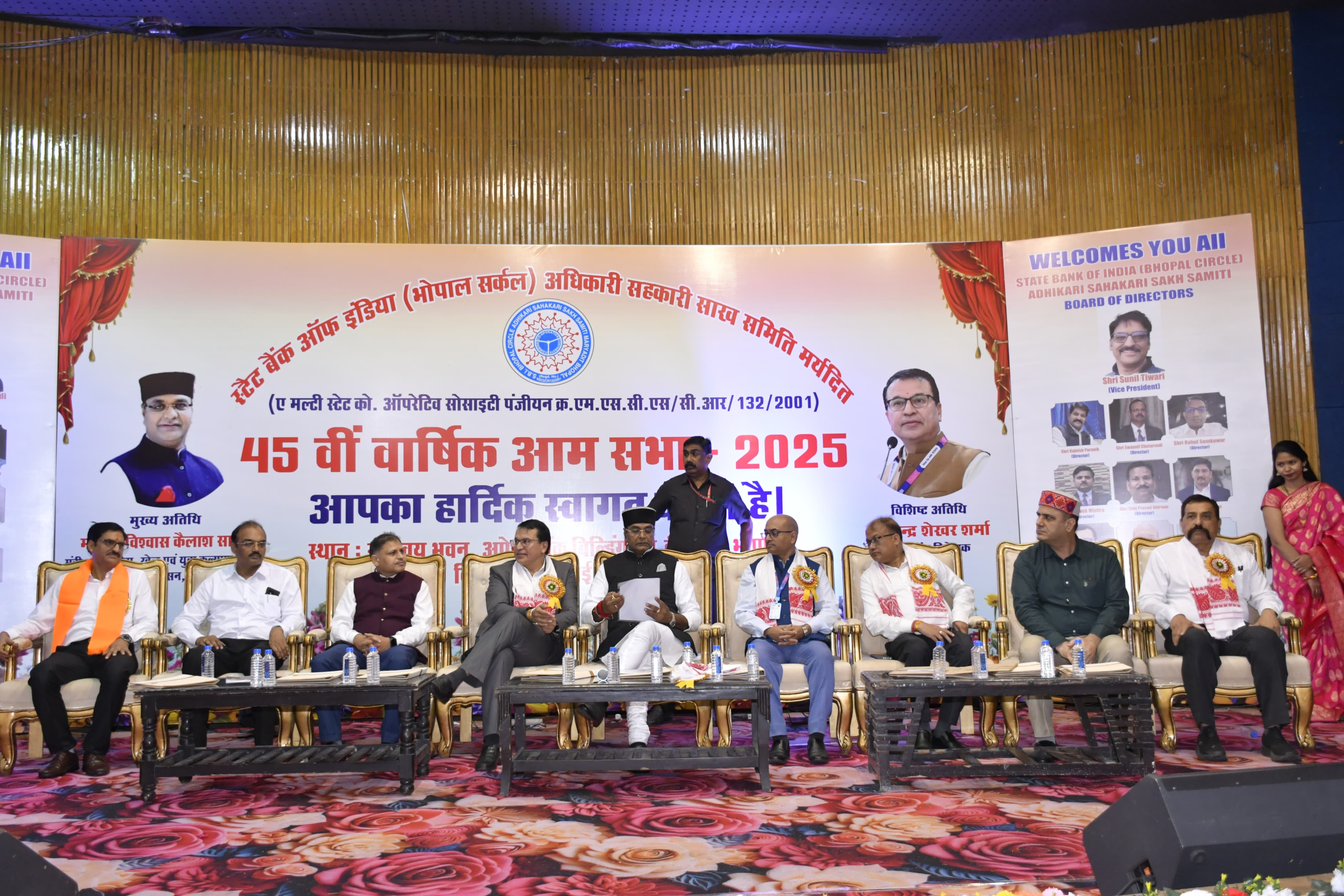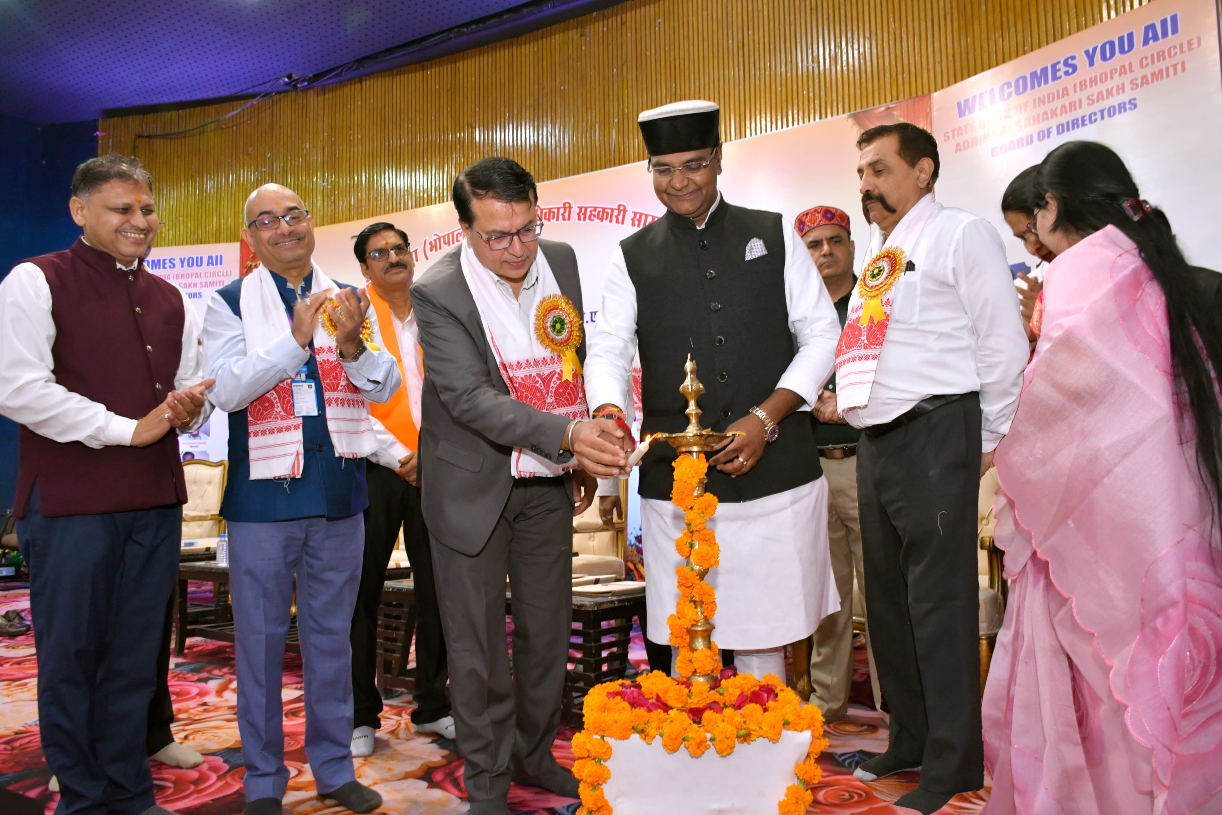 Earlier, the Annual General Meeting was inaugurated with a lamp-lighting ceremony by Vishwas Kailash Sarang, Minister of Cooperation, Sports, and Youth Welfare, Madhya Pradesh; Chandrashekhar Sharma, Deputy Managing Director; Manish Mathpal, Deputy General Manager and Regional Development Officer for Human Resources, SBI Local Head Office, Bhopal; Anil Srivastava, President of SBI Officers Association; Sanjeev Mishra, General Secretary; Praveen Meghani, President of SBI Employees Cooperative Credit Society; Suresh Babu Meena, President of SBI Officers Cooperative Credit Society; Vice President Sanjay Dwivedi; and Sunil Tiwari.