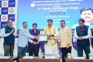 The proceedings of the house began with the President’s address and the oath-taking of members. During the Question Hour, opposition members raised sharp questions, which were answered by the ruling party ministers in a measured and precise manner. The jury panel included M.K. Rajouria (Deputy Director, Parliamentary Institute), Ramesh Mahajan (Retired Deputy Secretary, Madhya Pradesh Legislative Assembly Secretariat), Arun Mishra (Assistant Professor of Law, State-Level Law College), and Anita Gendhar (Youth Parliament In-Charge).